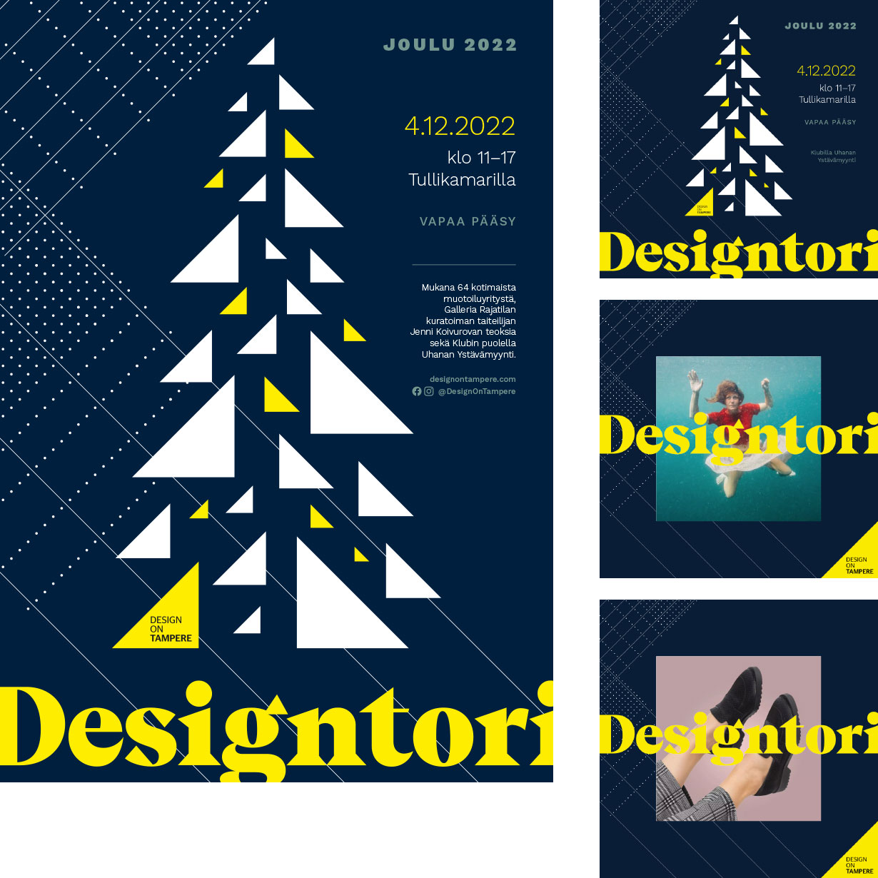 Joulun 2022 Designtorin ilme rakentui vihmovasta lumesta, rännästä ja lumisesta kuusesta viitteellisine valoineen, joista yksi on DOT:n keltainen kolmiotunnus. Designtori loistaa valona pimeydessä!