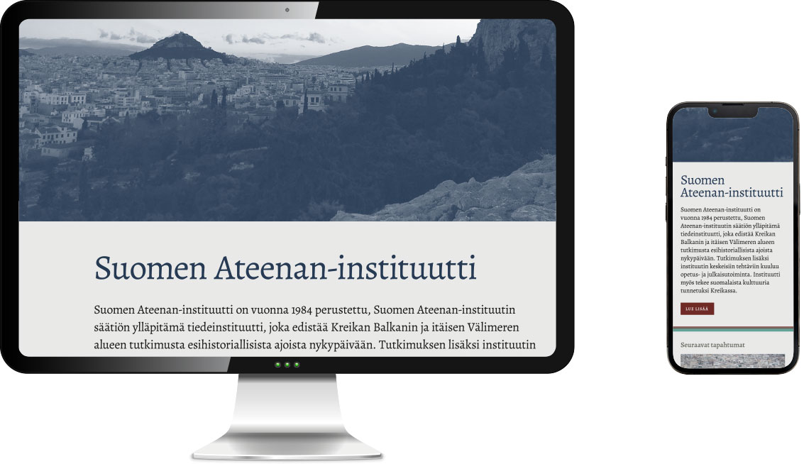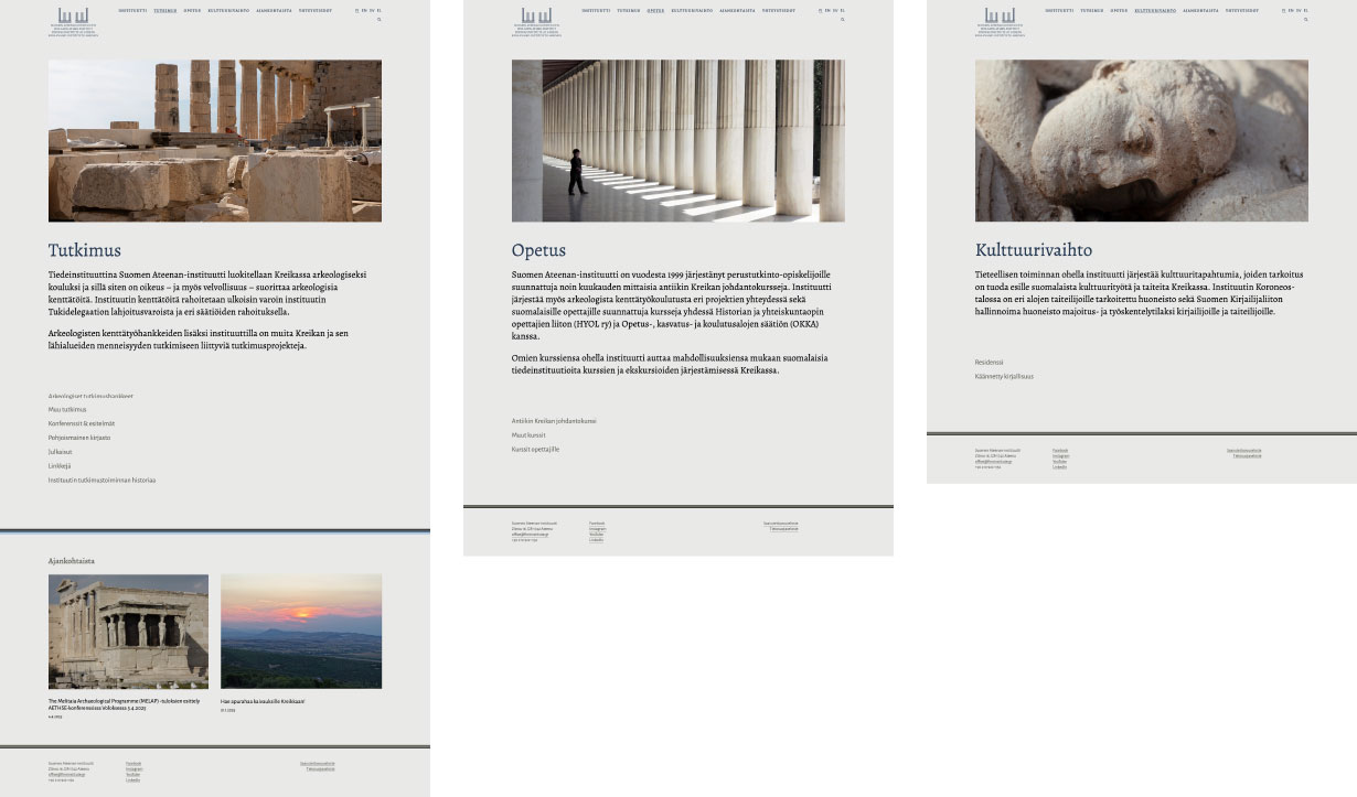 Suomen Ateenan-instituutilla ei ollut graafista ilmettä, kun nettisivuston ulkoasua alettiin suunnitella. Niinpä instituutille luotiin typografia ja väripaletti samassa yhteydessä. Typografia suunniteltiin klassiseksi, ja värit valikoituivat instituuttirakennuksen kiinnostavasta katto-ornamentiikasta, josta myös sisältöä rytmittävät viivaelementit hakivat inspiraationsa. Kuvituskuvina käytettiin sekä instituutin omia että paikallisen valokuvaajan kuvia.